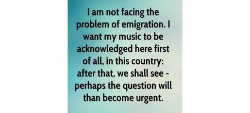 "I am not facing the problem of emigration. I want my music to be acknowledged here first of all, in this country: after that, we shall see - perhaps the question will than become urgent."